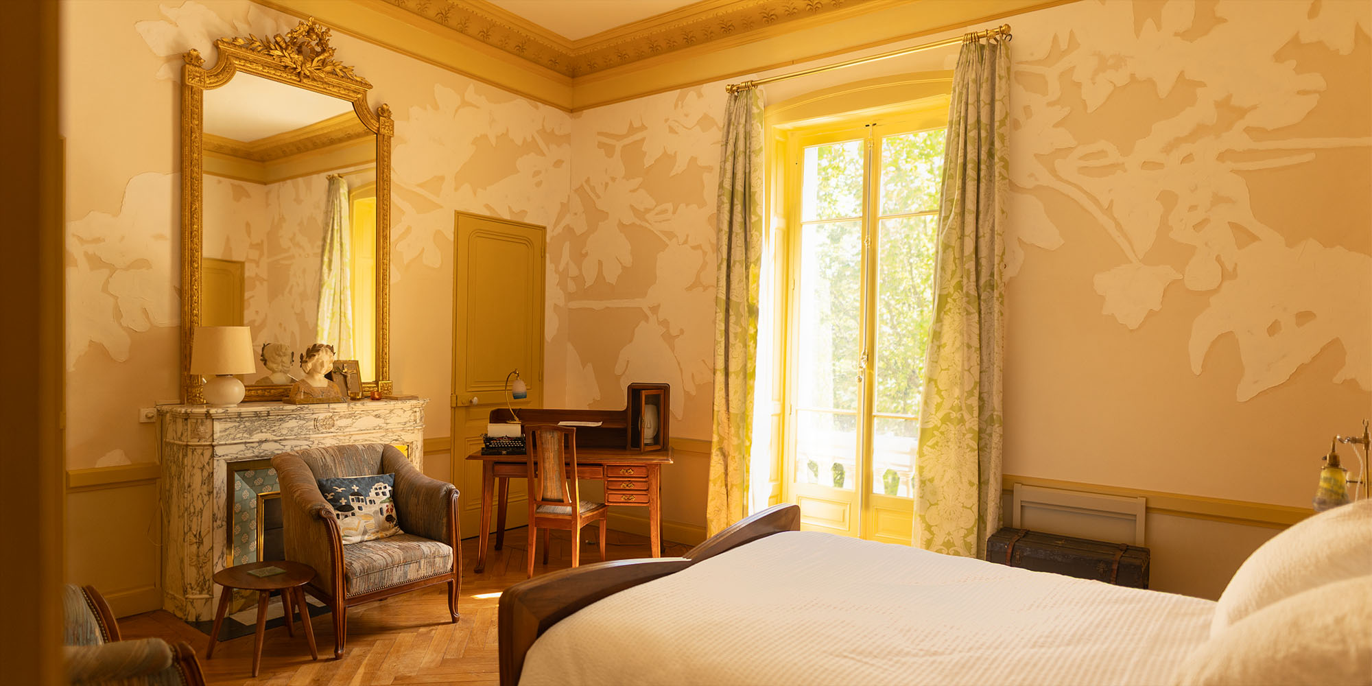 La chambre des Muses est joyeuse et lumineuse avec ses teintes faux-or et anis clair. Les murs ont un décor original peint par Jocco, artiste-peintre qui renoue de manière contemporaine avec l'esprit de fantaisie florale cher aux créateurs Art Nouveau. Partagez le raffinement 1900 avec un parquet à bâtons rompus en chêne massif sans noeud, ciré à la cire d'abeille, la cheminée en marbre et laiton et les rideaux en soie.